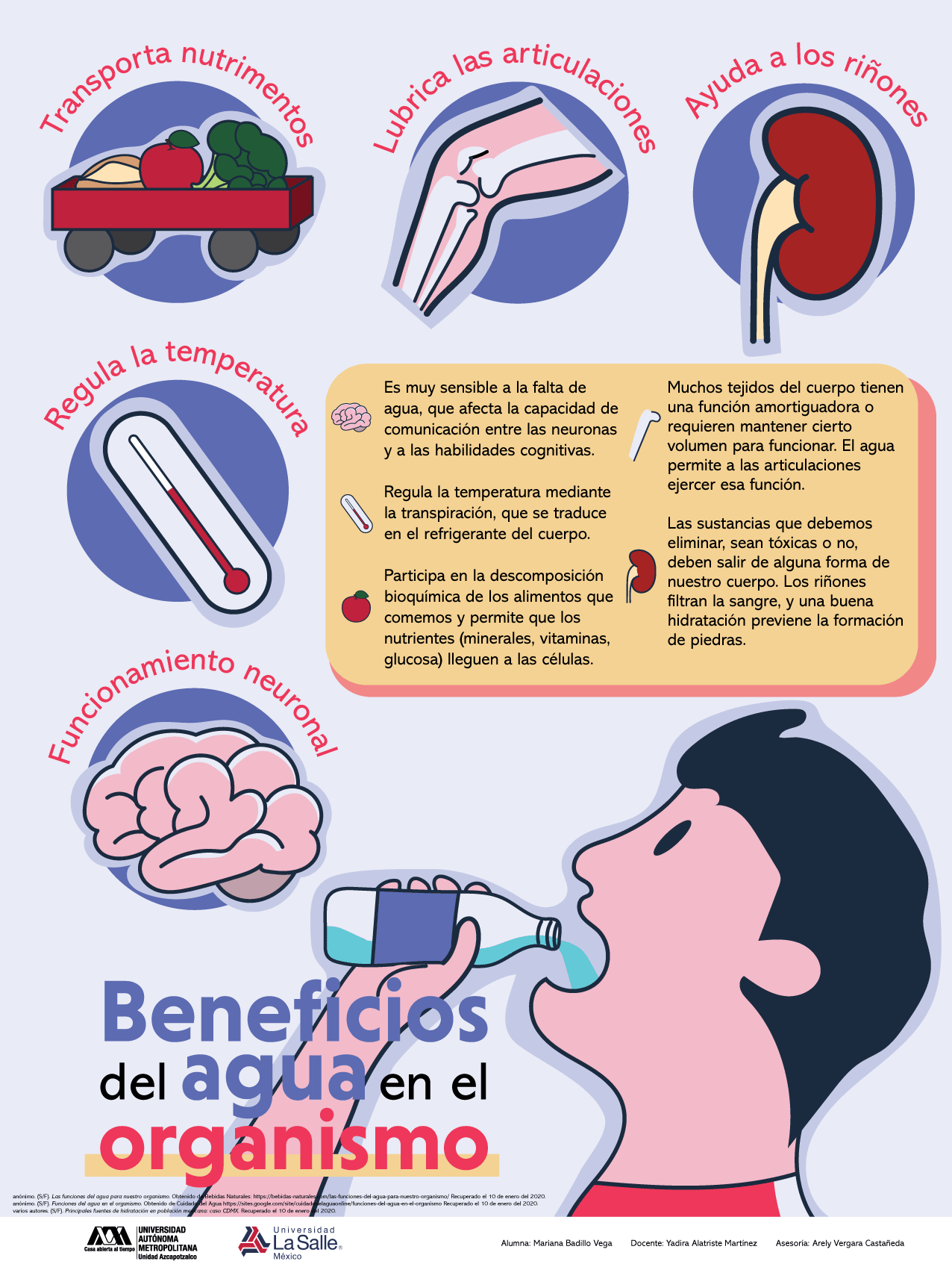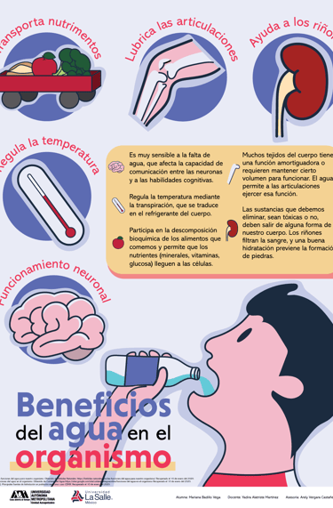 The purpose of the infography is to share information about the importance and benefits of drinking water in the organism for a campaign in "La Salle México" to promote this activity.